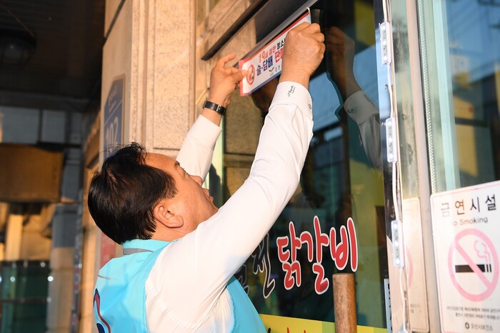 ▲ 청소년 보호법 준수 사항이 쓰인 스티커를 부착하는 모습(오산시 제공) |