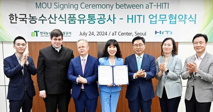 ▲한국농수산식품유통공사-HITI MOU. 한국농수산식품유통공사 김춘진 사장(우측 3번째), HITI 레이먼드 셰플러 CEO(우측 5번째), 김소연 슈뢰더-김 비영리재단 이사장(우측 4번째)aT 제공 |