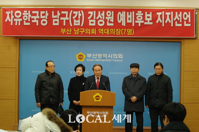 [로컬세계 맹화찬 기자]부산 남구의회 역대 의장 7명이 남갑 선거구에서 ‘4·15 총선’ 예비후보로 뛰고 있는 자유한국당 김성원 후보 지지를 선언했다.