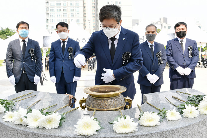 염태영 수원시장이 6일 수원현충탑에서 열린 제65회 현충일 추념식에서 분향하고 있다. 수원시와 경기도가 공동주관한 이날 제65회 현충일 추념식은 순국선열과 호국영령에 대한 묵념으로 시작해 국민의례, 헌화·분향 ‘현충의 노래’ 제창으로 이어졌다.