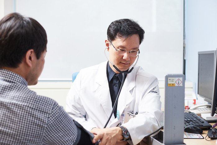 ▲강동경희대병원 심장혈관내과 박창범 교수가 한 남성환자를 진료하고 있다. [강동경희대병원 제공] |
