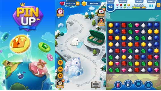 | ▲한국암웨이가 런칭한 모바일 게임 ‘핀업’, 좌측부터 메인 화면, 레벨 이동, 실제 게임 장면.(암웨이 제공) |