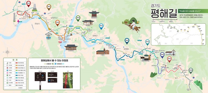개통된 ‘평해길’은 총 10개 구간(구리 1개, 남양주 2개, 양평 7개), 전체 125km에 이르는 장거리 탐방로로 망우묘역을 비롯해 조말생묘, 정약용유적지, 지평향교 등의 많은 문화유산이 자리 잡고 있다.