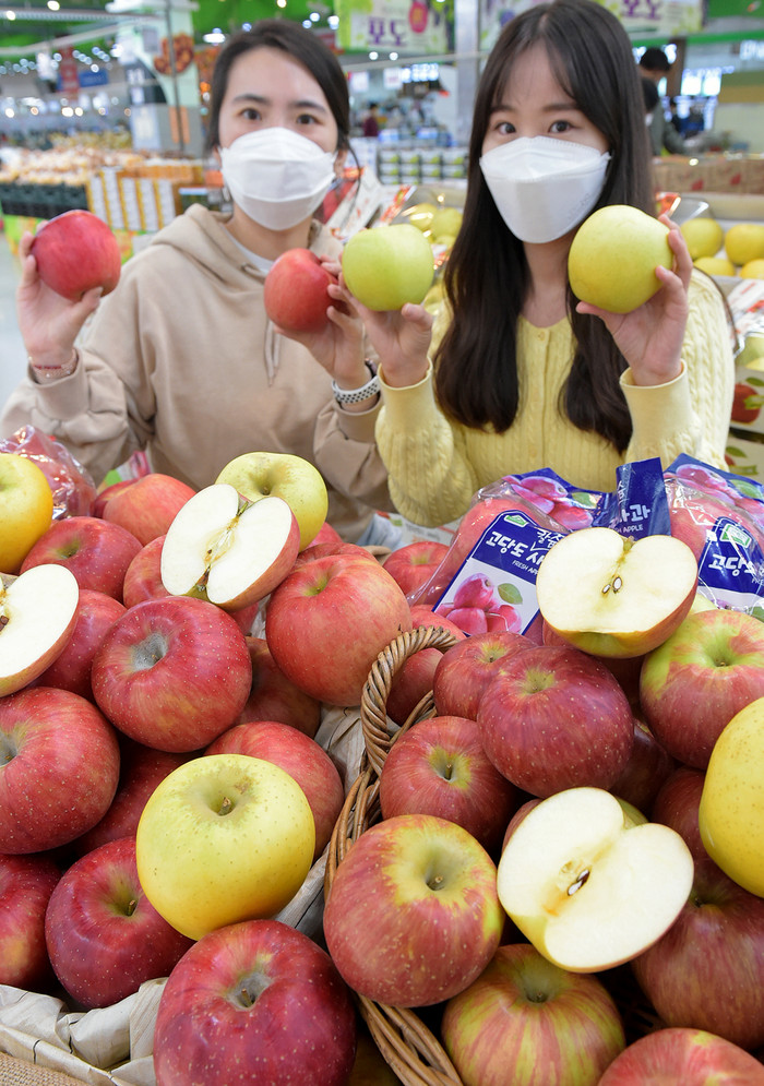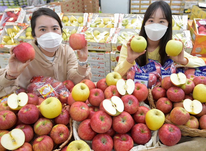 | ▲13일 서울 서초구 농협 하나로마트 양재점에서 모델들이 다양한 ‘사과’를 선보이고 있다. |