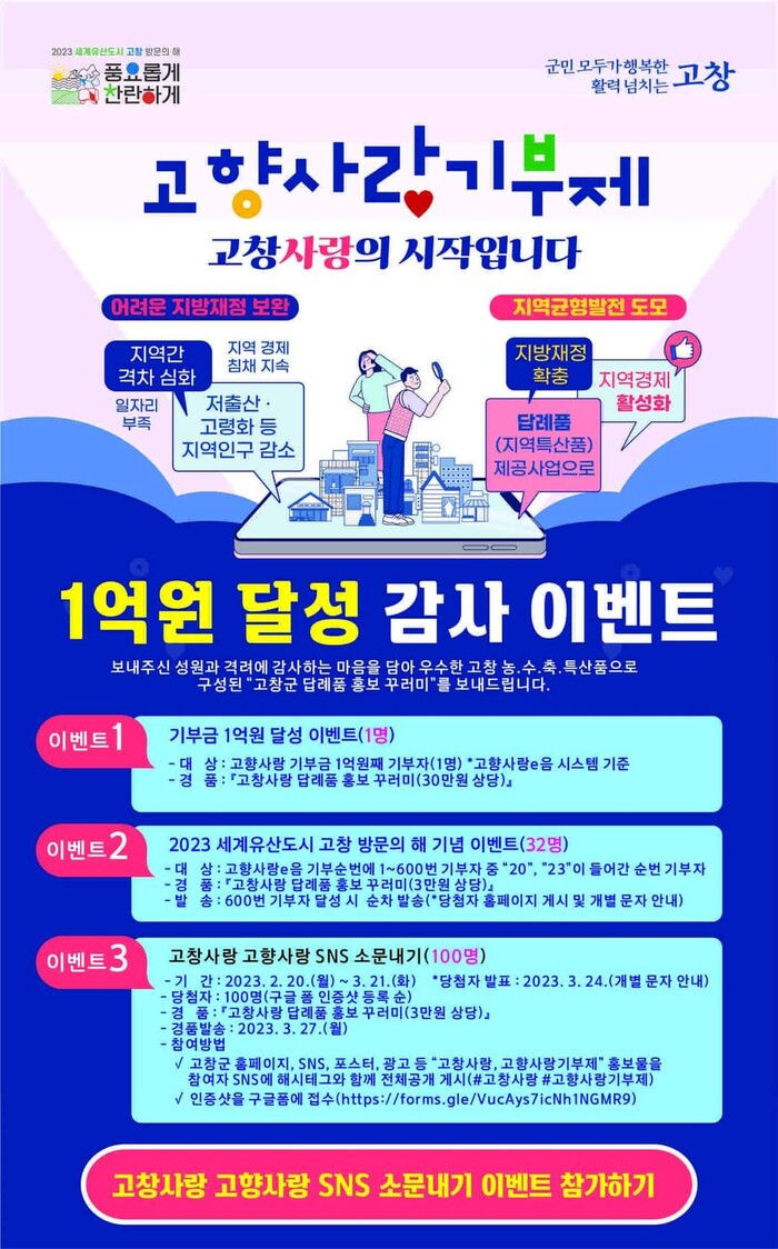 또한 ‘2023 세계유산도시 고창 방문의 해’를 맞아 ‘20’과 ‘23’이 들어간 순번대 기부자 33명에게 3만원 상당 “고창사랑 답례품 홍보 꾸러미”를 경품으로 제공한다.