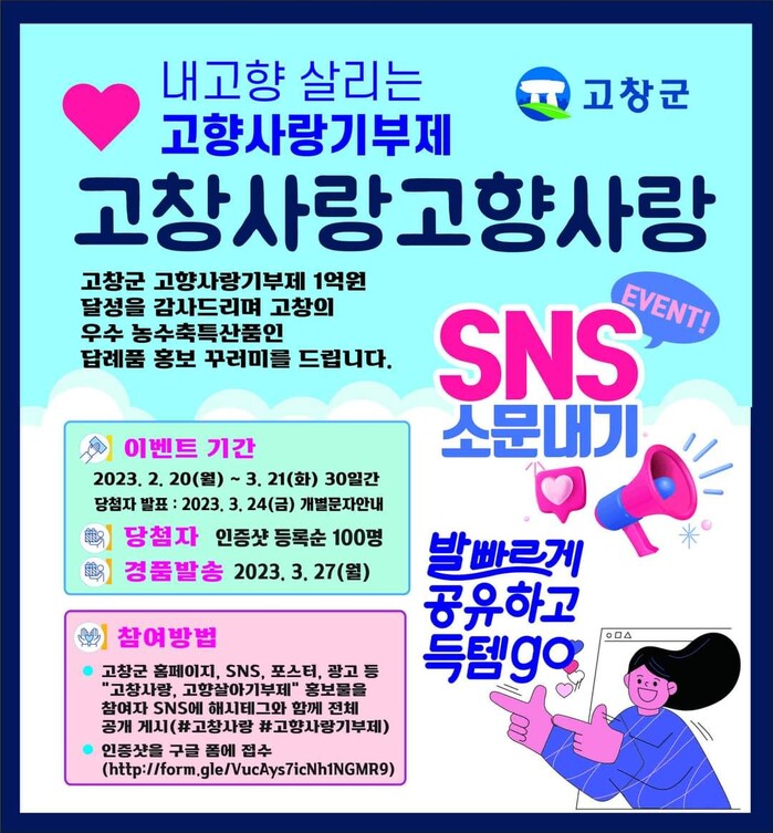 -고창사랑, 고향사랑 SNS 공유이벤트 참가자 100명에게 3만원 상당 지급