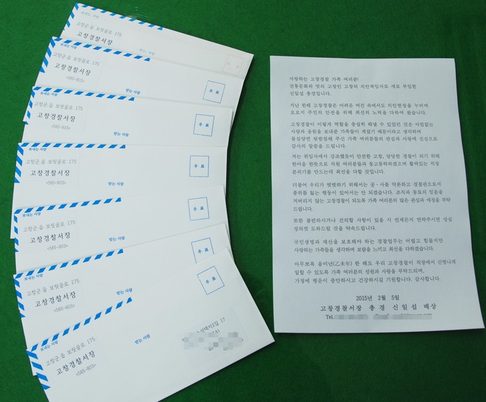 서한문에서 신일섭 서장은 고창경찰서로의 첫 부임인사를 시작으로 어려운 여건속에서 각자의 역할에 충실한 고창경찰을 칭송하고 당당한 경찰로 자리매김하기 위한 가족들의 변함없는 응원과 관심을 당부했다.