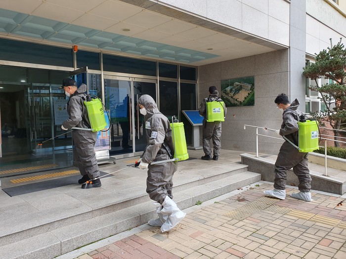 어린이집은 전문 방역업체를 통해 방역을 실시하고 있으며, 학교, 학원 밀집상가 등은 해병 2사단 및 육군 제17사단 장병들과 함께 건물 내·외부 방역을 실시하고 있다.