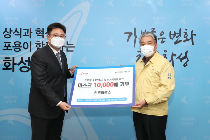 [로컬세계 고용주 기자]경기 화성시는 2일 신원비에스에서 시에 마스크 1만 장을 후원했다고 밝혔다.