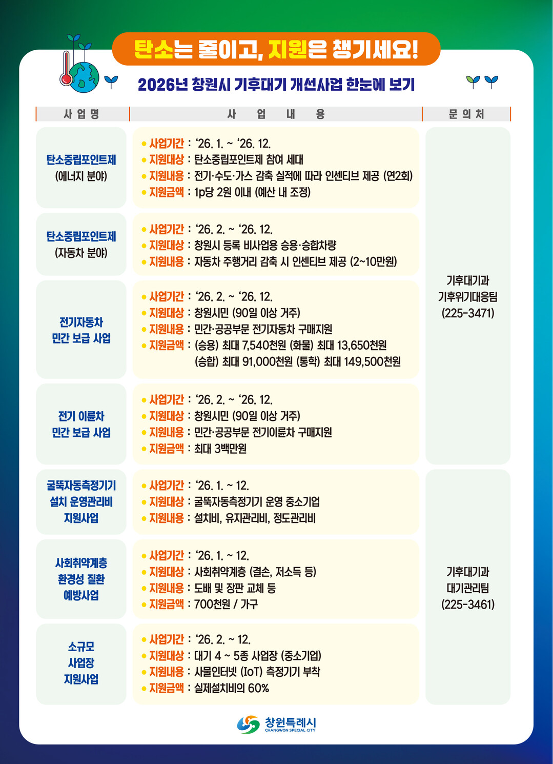 경남 창원특례시는 2026년 시민과 기업이 생활 속에서 탄소중립 실천에 참여할 수 있도록 다양한 기후·환경 지원사업을 추진한다고 9일 밝혔다.