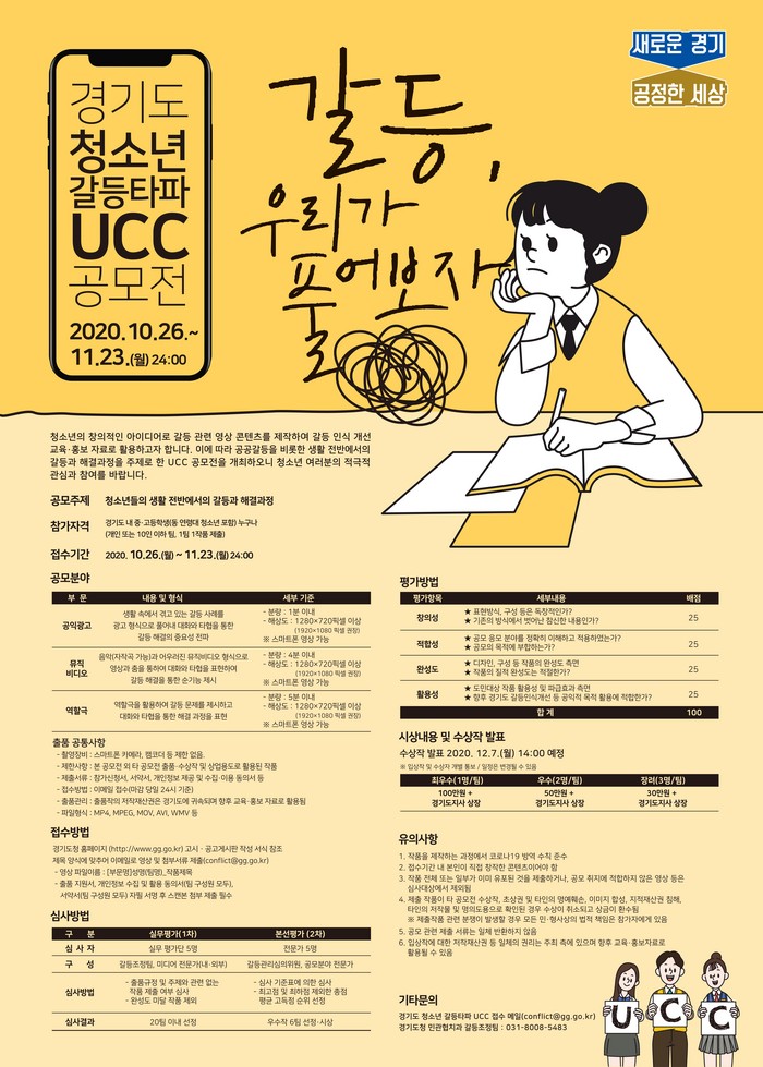 [로컬세계 고기훈 기자]경기도가 창의적인 아이디어를 통한 도내 청소년들의 갈등인식 개선 프로젝트 ‘‘갈등, 우리가 풀어보자’ 경기도 청소년 갈등타파 사용자 제작 콘텐츠(UCC) 공모전’을 개최한다고 30일 밝혔다.