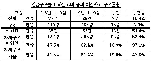 17일 수협중앙회 어선안전조업본부에 따르면 올해 1~9월 중 발생한 긴급구조를 요하는 6대 중대 어선사고(충돌·좌초·화재·침몰·전복·침수)에서 동료 어업인에 의해 구조된 인원 비율이 전년 대비 1.5배 가까이 늘어난 것으로 집계됐다.