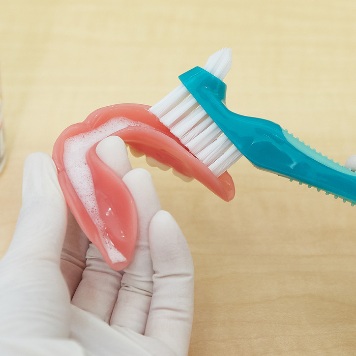 손위생 시행 후 입안에서 틀니를 제거하고, 젖은 수건이나 물이 담긴 대야 위에서 부드러운 칫솔을 이용하여 틀니 전용치약이나 식기를 세척하는 주방용 세제를 묻혀 닦는다.