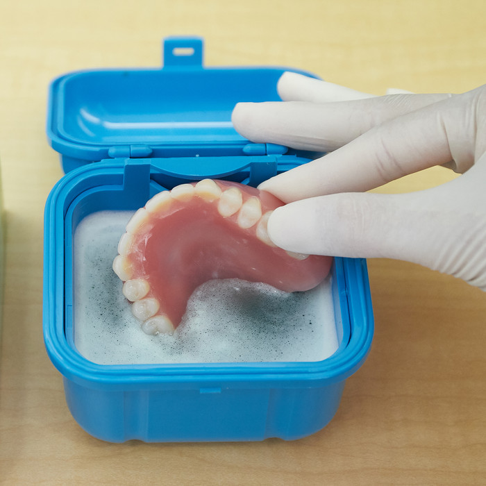 강동경희대학교병원 보철과 안수진 교수는 “국내 한 조사에 따르면 틀니 사용자 10명 중 7명은 일반 치약, 소금 등 잘못된 방법으로 틀니를 세척하고 있다”면서 “특히 일반 치약을 사용하는 경우가 많은데, 일반 치약은 오히려 틀니를 세균의 온상으로 만드는 주범이다”라고 설명했다. 틀니는 치아보다 약한 플라스틱 재질이라서 치약으로 닦으면, 틀니 표면에 상처가 나고 그 틈새로 구취 및 의치성 구내염 등 질환 유발 세균이 번식될 수 있으므로 반드시 전용세제를 사용한다. 틀니는 전용세제로 하루 3번 세척하고, 잘 때는 따로 빼서 물에 잠기게 보관해야 한다.