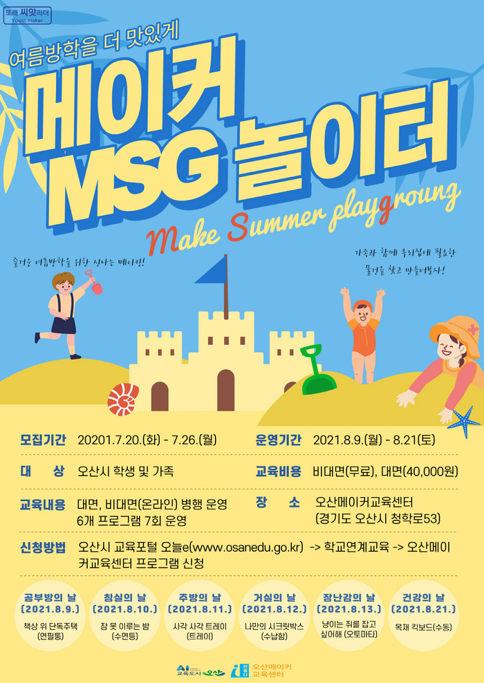 [로컬세계 김병민 기자]경기 오산시(시장 곽상욱)는 오산메이커교육센터가 9일부터 21일까지 관내 학생 120명을 대상으로 ‘여름방학을 더 맛있게’라는 주제의 여름방학 메이커 프로그램을 대면·비대면으로 운영한다고 11일 밝혔다.