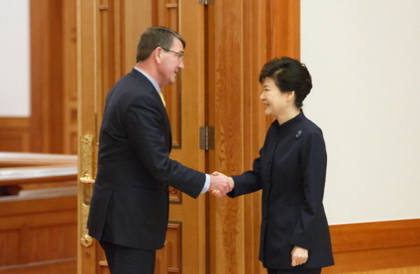 ▲ 박근혜 대통령이 지난 4월10일 청와대를 방문한 애쉬턴 카터 미국 국방부 장관을 접견하고 있다. |