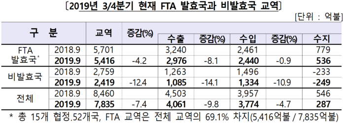 같은 기간 FTA 비발효국과의 무역수지가 249억 달러 적자인 것과 비교해 보면 미·중 무역분쟁 장기화 등 대외 경제환경 악화 속에서도 FTA 교역이 무역수지 흑자 유지에 기여한 것으로 보인다.