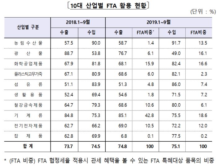 아울러 산업부 통계분류코드(MTI) 기준에 따라 농림수산물·화학공업·섬유류·기계류 등 총 10개 산업별로 FTA 수출입 활용률을 살펴봤다.