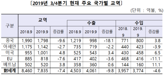 국가별 교역량은 전년동기 대비 미국(4.8%↑), 베트남(3.8%↑)과의 교역이 증가한 것을 제외하면 중국(9.6%↓), EU(7.6%↓), 아세안(2.7%↓) 등 대부분 국가와는 감소하였다.