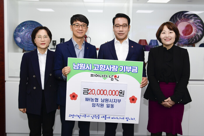 최경식 남원시장은 “남원시지부와 남원시가 함께 피어날 수 있도록 고향사랑기부제 정착과 건전한 기부문화 조성을 위해 힘써주신 남원시지부 임직원 여러분께 진심으로 감사드린다”고 인사를 전했다.
