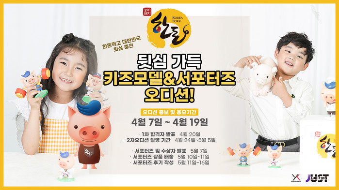 이번 오디션은 기존 키즈모델 뿐 아니라 키즈모델에 관심 있는 40개월부터 18세 이하 어린이는 누구나 응모 가능하며, 1차 온라인 응모, 2차 촬영 오디션을 통해 100명의 서포터즈를 선발할 예정이다. 서포터즈로 선발된 100명에게는 한돈 선물세트가 주어지며, 이 중 키즈모델로 최종 선발된 어린이는 한돈 바이럴 영상의 모델로 활약하게 된다.