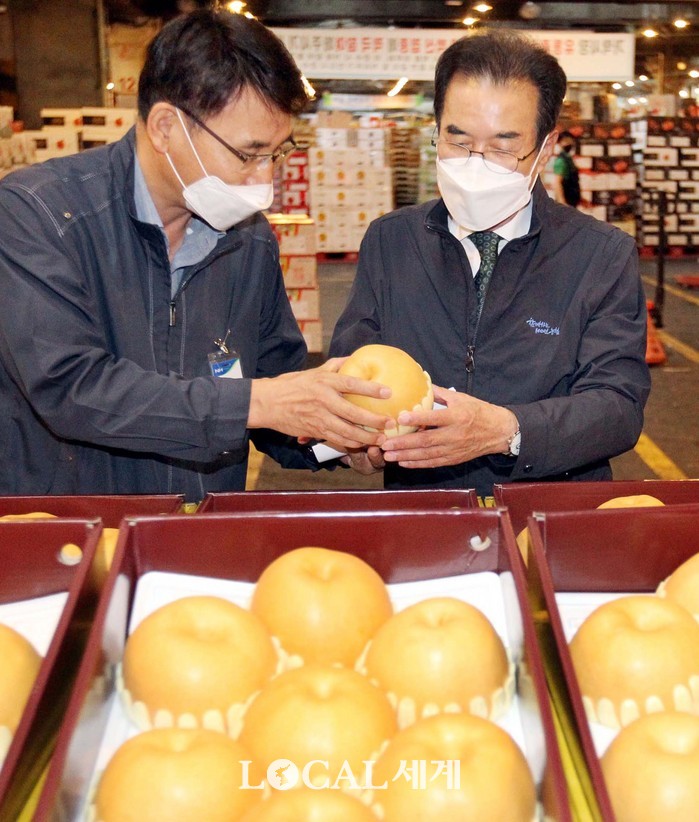이성희 농협중앙회장이 8일 가락동 농수산물도매시장 내 농협가락공판장을 방문하여 추석 명절 성수품의 수급상황과 가격동향을 점검하고 직원들을 격려했다. 농협중앙회 이성희 회장(오른쪽) 심민섭 가락공판사업분사장(왼쪽).