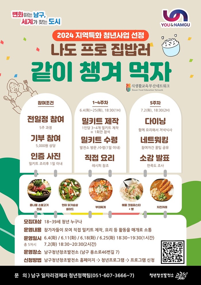 이 프로그램은 남구 거주 또는 활동 1인가구 청년을 대상으로 주 1회, 총 5주간 운영된다.