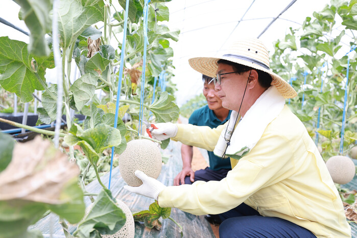 ▲폭염 속 구슬땀을 흘리고 있는 멜론 재배농가도 방문해 격려와 농가 체험을 하고있다. |