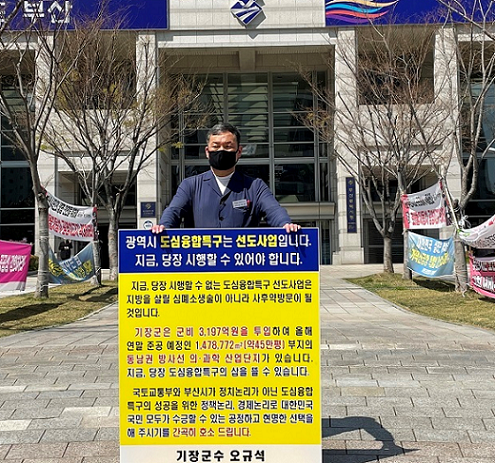 오 군수는 지난 2월부터 현재까지 국토교통부와 부산시청 앞에서 ‘기장군 도심융합특구“를 위한 1인 시위를 3차례 한 바 있다.