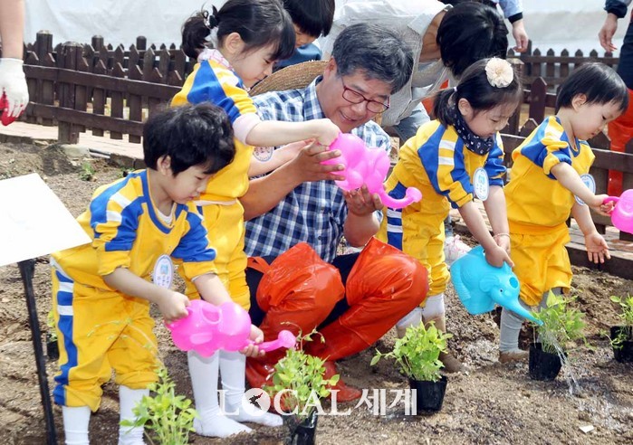 농협유통은 26일 하나로마트 양재점 하나로 새공원에서 어린이들과 함께 농작물을 가꾸는 ‘어린이 농부 현장학습’을 실시했다. 농협유통 이수현 대표이사(가운데)와 어린이들이 텃밭에 더덕 물주기를 하고 있다.