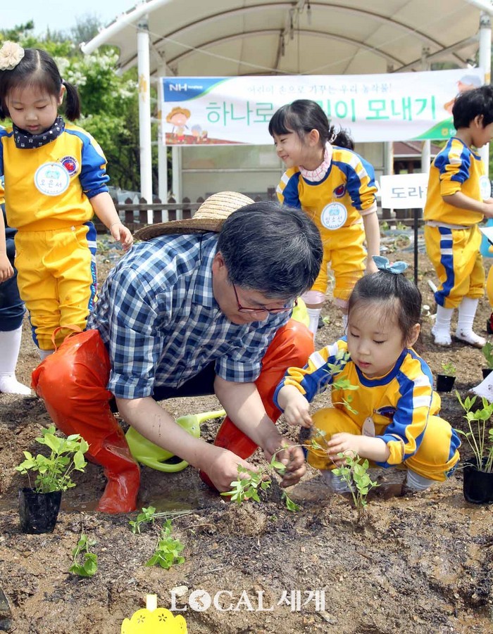 농협유통은 26일 하나로마트 양재점 하나로 새공원에서 어린이들과 함께 농작물을 가꾸는 ‘어린이 농부 현장학습’을 실시했다. 농협유통 이수현 대표이사와 어린이들이 텃밭에 더덕, 목화, 개똥쑥을 심고 있다.