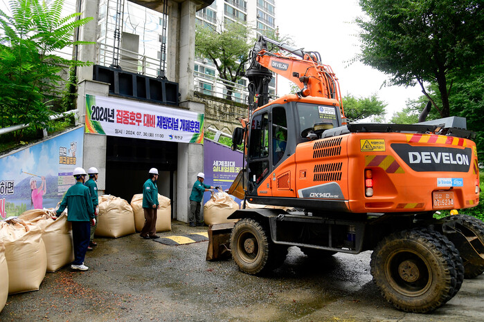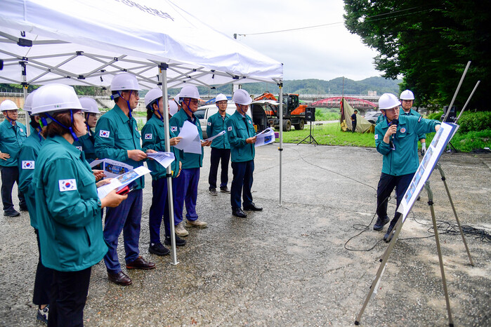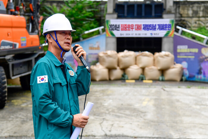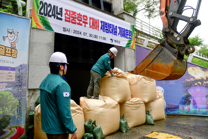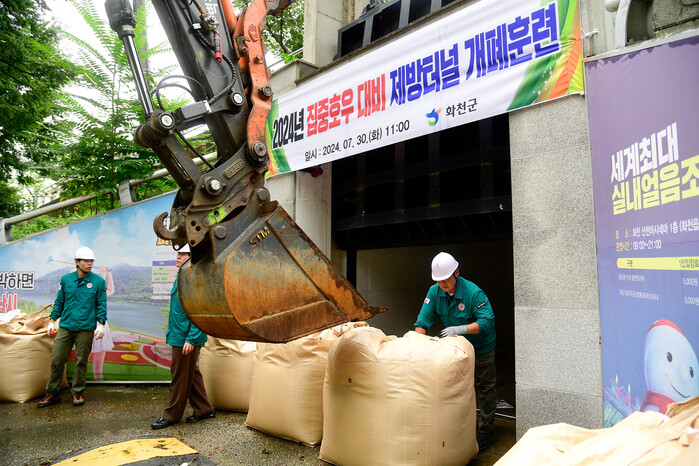 화천군은 30일 화천천과 화천읍 시내를 연결하는 터널에서 시간 당 80㎜의 극한호우를 대비한 수문개폐 훈련을 실시했다.(사진=화천군 제공)