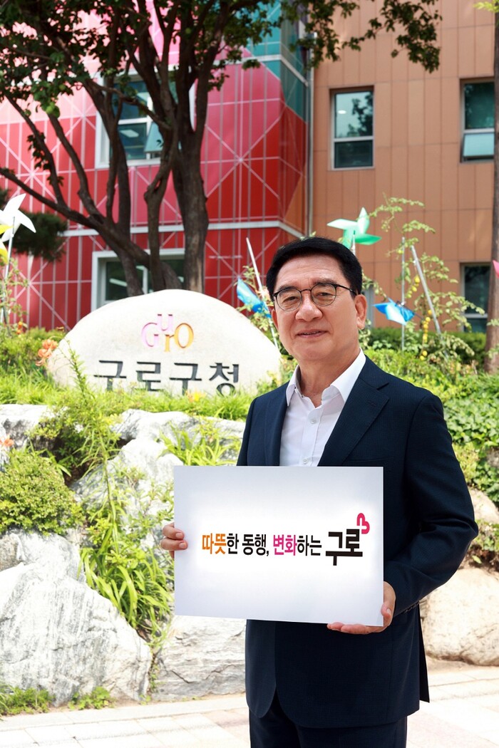 ▲민선8기 확정된 새 구정 슬로건을 문헌일 구청장이 들고 있다. 구로구 제공 |