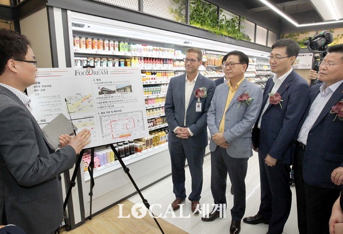 | ▲편의점 세븐일레븐은 23일 푸드를 중심으로 한 다채로운 생활 먹거리와 쇼핑 공간으로 특화된 프리미엄 편의점 모델 '푸드드림(Food Dream; 서울 한남동 소재)'을 오픈했다. 정승인 세븐일레븐 대표이사(오른쪽에서 세 번째), 마이크 미국 세븐일레븐 선임이사(오른쪽에서 네 번째), 안규동 세븐일레븐 전무(오른쪽에서 두 번째) 등 참석자들이 실무자 설명을 듣고 있다. |