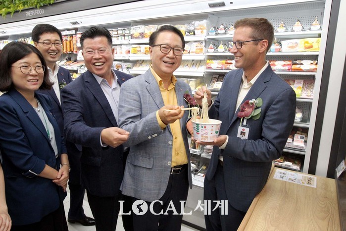 | ▲편의점 세븐일레븐은 23일 푸드를 중심으로 한 다채로운 생활 먹거리와 쇼핑 공간으로 특화된 프리미엄 편의점 모델 '푸드드림(Food Dream; 서울 한남동 소재)'을 오픈했다. 정승인 세븐일레븐 대표이사, 마이크 미국 세븐일레븐 선임이사가 키친시스템을 적용한 즉석푸드 플랫폼에서 국수를 시식하고 있다. |