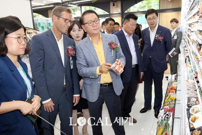 | ▲ 편의점 세븐일레븐은 23일 푸드를 중심으로 한 다채로운 생활 먹거리와 쇼핑 공간으로 특화된 프리미엄 편의점 모델 '푸드드림(Food Dream; 서울 한남동 소재)'을 오픈했다. 정승인 세븐일레븐 대표이사, 마이크 미국 세븐일레븐 선임이사 등 참석자들이 '세븐일레븐 푸드드림' 점포 내부를 둘러보고 있다. |
