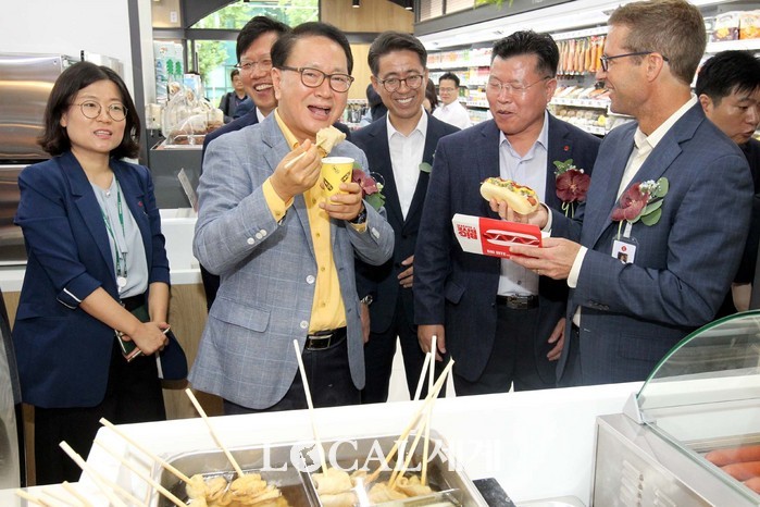 | ▲편의점 세븐일레븐은 23일 푸드를 중심으로 한 다채로운 생활 먹거리와 쇼핑 공간으로 특화된 프리미엄 편의점 모델 '푸드드림(Food Dream; 서울 한남동 소재)'을 오픈했다. 정승인 세븐일레븐 대표이사, 마이크 미국 세븐일레븐 선임이사가 즉석 핫도그 '빅바이트'를 시식하고 있다. |