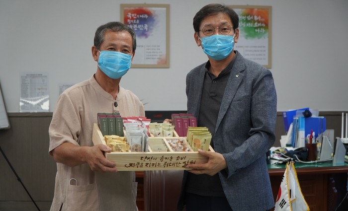 ▲24일 수원 aT농식품유통교육센터에서 진행된 에코-프라이데이 캠페인 현판식에서, 주형로 친환경농산물자조금위원장(왼쪽)이 이윤용 aT농식품유통교육원장(오른쪽)에게 '친환경 다과함'을 전달하고 있다. |