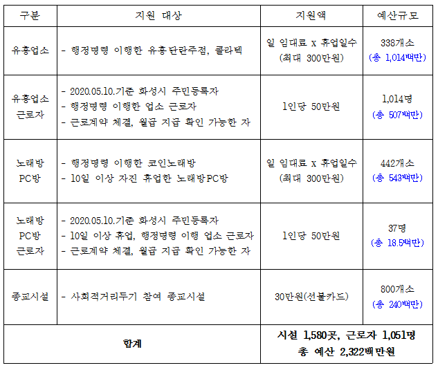 [로컬세계 고용주 기자]경기 화성시가 사회적 거리두기에 동참하고 있는 유흥업소, 노래방·PC방 등 다중이용시설에 최대 300만원의 재난지원금을 지급한다. 해당 업소 종사자에게는 1인당 50만원씩 지급한다고 9일 밝혔다.