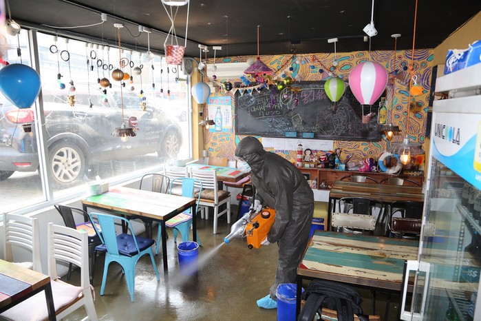 | ▲한샘 홈케어 방역전문가가 소상공인 매장 방역을 진행하고 있다. |