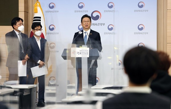 ▲황희 문화체육관광부 장관이 지난 10일 오전 서울 종로구 정부서울청사 별관에서 관광산업 회복 및 재도약 방안 발표에 대해 사전브리핑을 한 뒤 기자의 질문에 답변하고 있다. (사진=문화체육관광부) |
