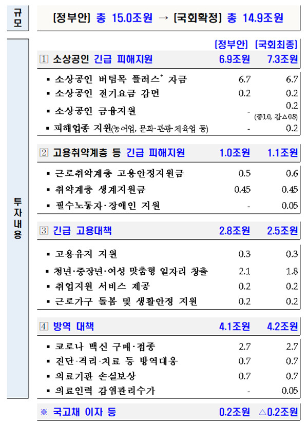 소상공인 긴급 피해지원 7조3000억원, 고용취약계층 등 긴급 피해지원 1조1000억원, 긴급 고용대책 2조5000억원, 백신구입 등 방역대책 4조2000억원 등으로 구성됐다.