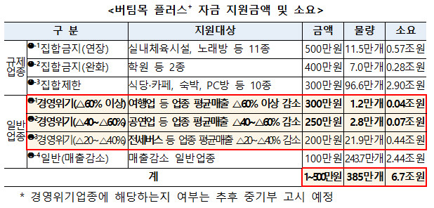 매출감소가 심각한 경영위기업종을 세분화해 지원유형(5→7종) 및 지원단가를 확대했다.