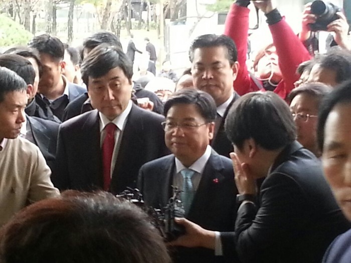 ▲권선택 대전시장이 공직선거법 위반 혐의로 조사받기 위해 대전지방검찰청에 들어서고 있다. |
