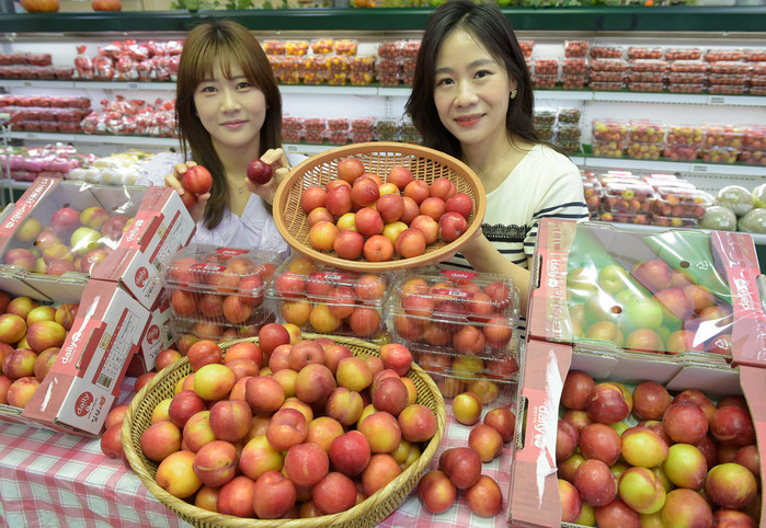 | ▲24일 서울 서초구 농협 하나로마트 양재점에서 모델들이 경북 김천지역에서 출하된 ‘대석 자두’를 소개하고 있다. 농협유통 제공 |