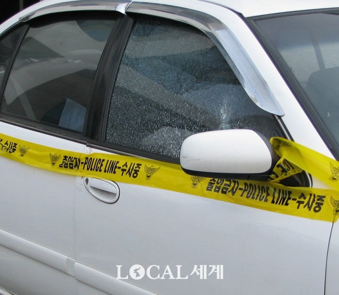 ▲피의자 강씨는 김씨의 둘째 오빠가 탄 차량의 운전석 문을 열고 머리를 조준해 살해했다. 이 차량 조수석 창문에는 총탄 흔적이 선명히 남아있다. ©로컬세계 |
