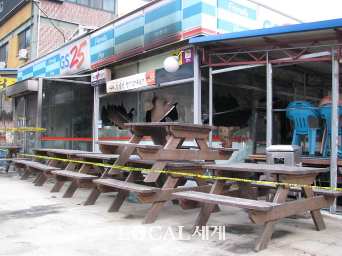 ▲피의자 강씨가 사실혼 관계였던 김씨와 동업 투자한 편의점에 시너를 뿌리고 불을 질렀다. 사진은 불에 탄 편의점에 폴리스라인이 쳐져 있다. ©로컬세계 |