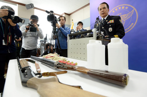 ▲이자하 세종경찰서장이 총격사건에 사용된 엽총을 앞에 두고 사건 브리핑을 하고 있다.연합뉴스 |