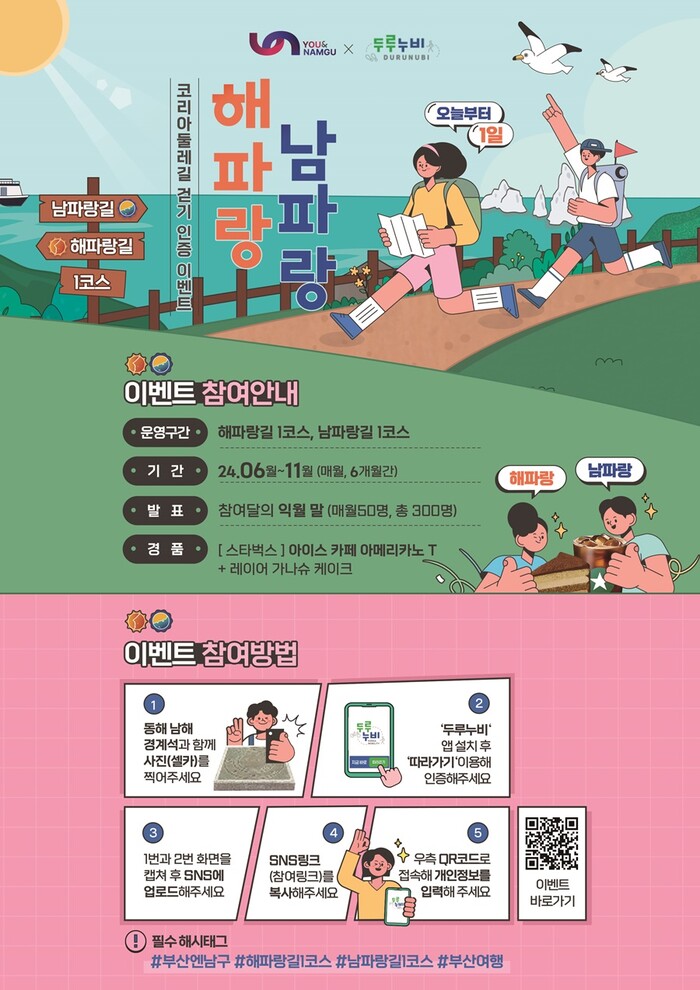 [로컬세계 부산=맹화찬 기자]부산 남구는 문화체육관광부 코리아둘레길 쉼터 및 연계 프로그램 지원 공모사업으로 코리아둘레길 걷기 인증 프로그램(부제: 해파랑 남파랑 오늘부터 1일) 이벤트를 운영한다.