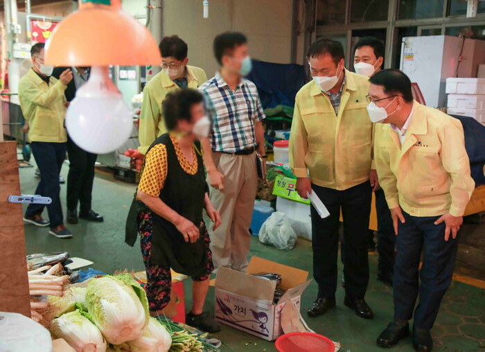 ▲수해점검 위해 10일 전통시장을 방문한 문헌일 구청장(오른쪽). 구로구 제공 |